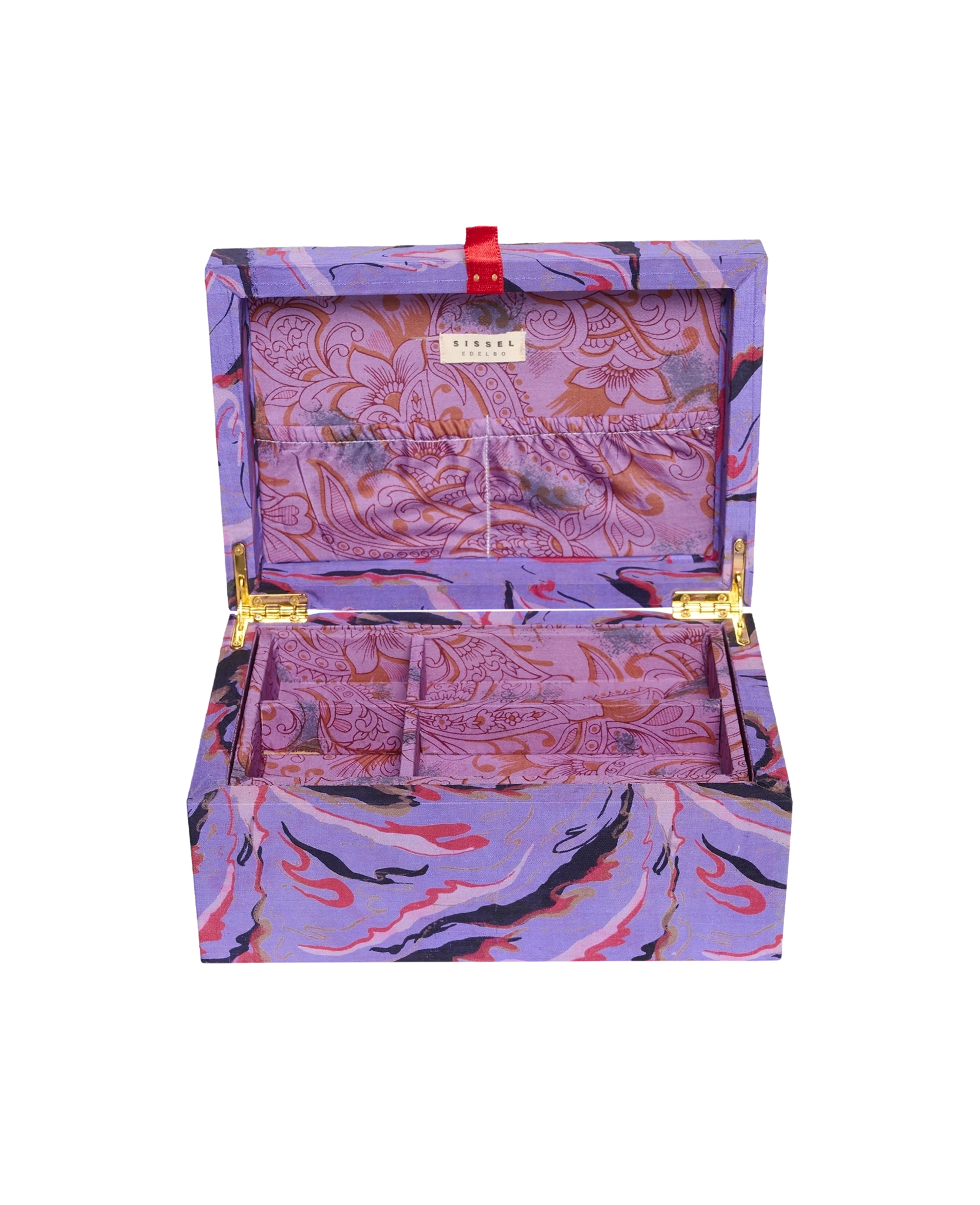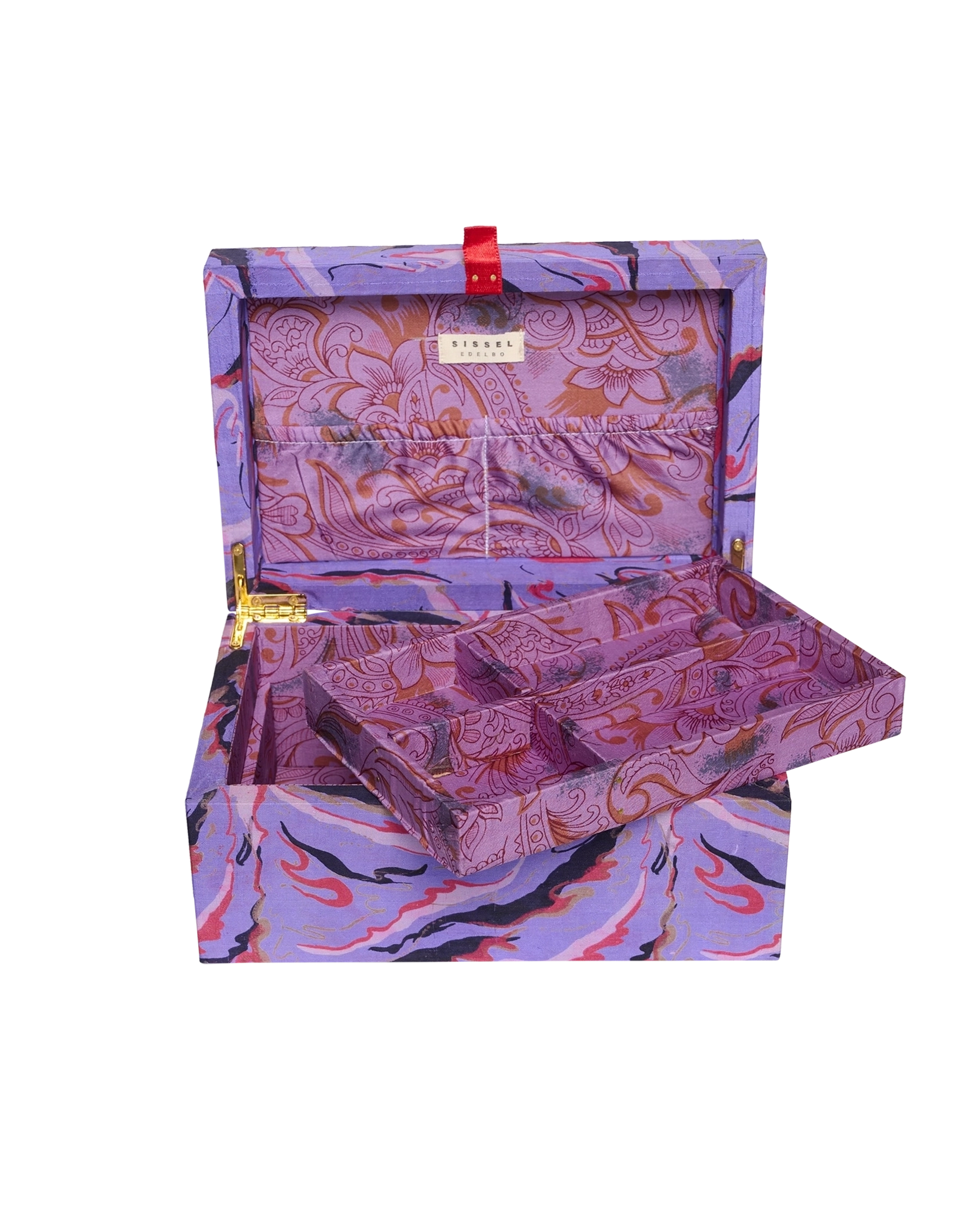 Et smukt og unikt smykkeskrin beklædt med vintage silkesari – perfekt til smykker, kort eller andre små skatte. Skrinet er håndlavet i træ, polstret med bomuld og dækket både indvendigt og udvendigt med to nøje afstemte silkesarier.